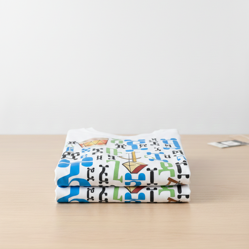 A white graphic tee with a playful abstract print in bold blues and warm accents. Fun, modern, and easy to style for everyday wear.