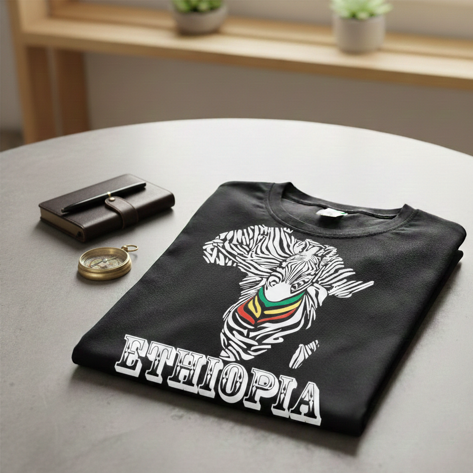 Black t-shirt with zebra graphic and 'Ethiopia' text on i